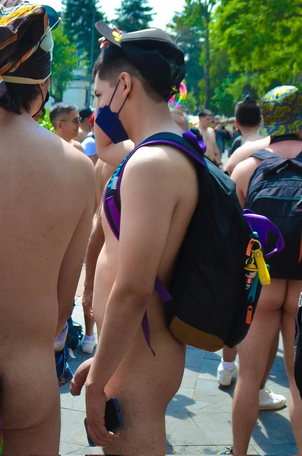 Slim guy with a backpack and sunglasses getting caught on cam while haing out in a park during the World Naked Bike Ride